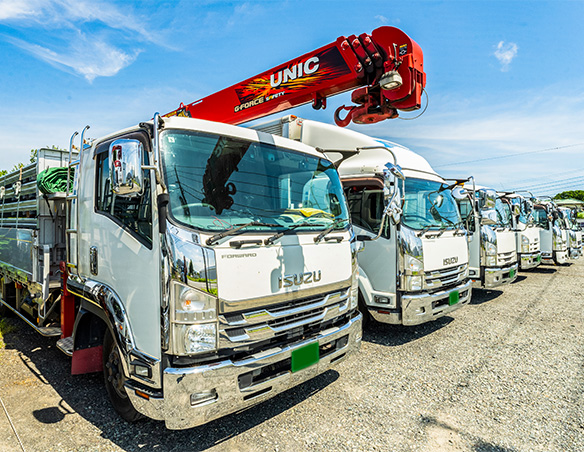 - クレーン車による高所荷下ろし、ウイング車による大容量輸送など多彩な車輌が強みです。