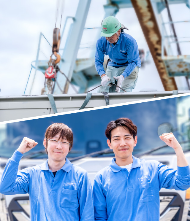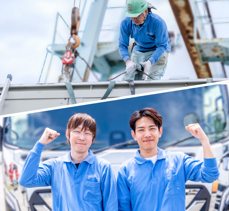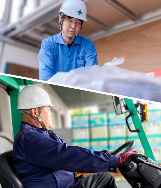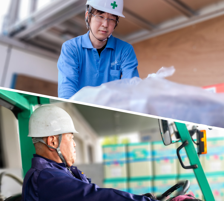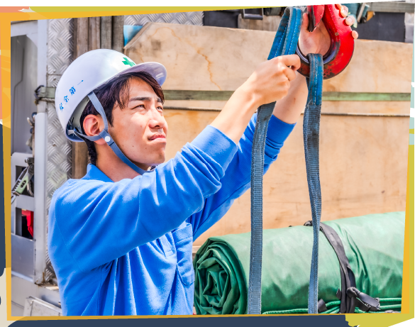 免許は日新物流に入社してからすべて取得しました。中型、大型、クレーン車、フォークリフト、なんでも乗ります。ルート配送の仕事、その日によって荷物もルートも異なる仕事、クレーン車でユニットハウスを運ぶ仕事。ドライバーといっても日新物流にはいろんな仕事があります。自分から先輩に教えてもらうことで、スキルの幅が広がりますよ。